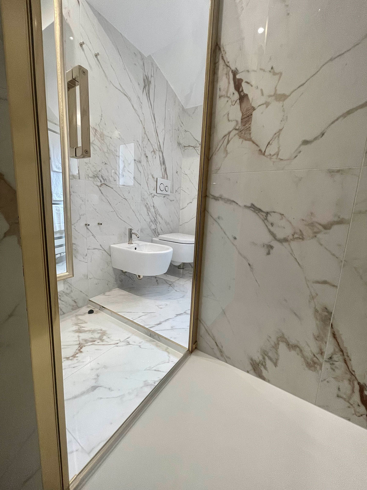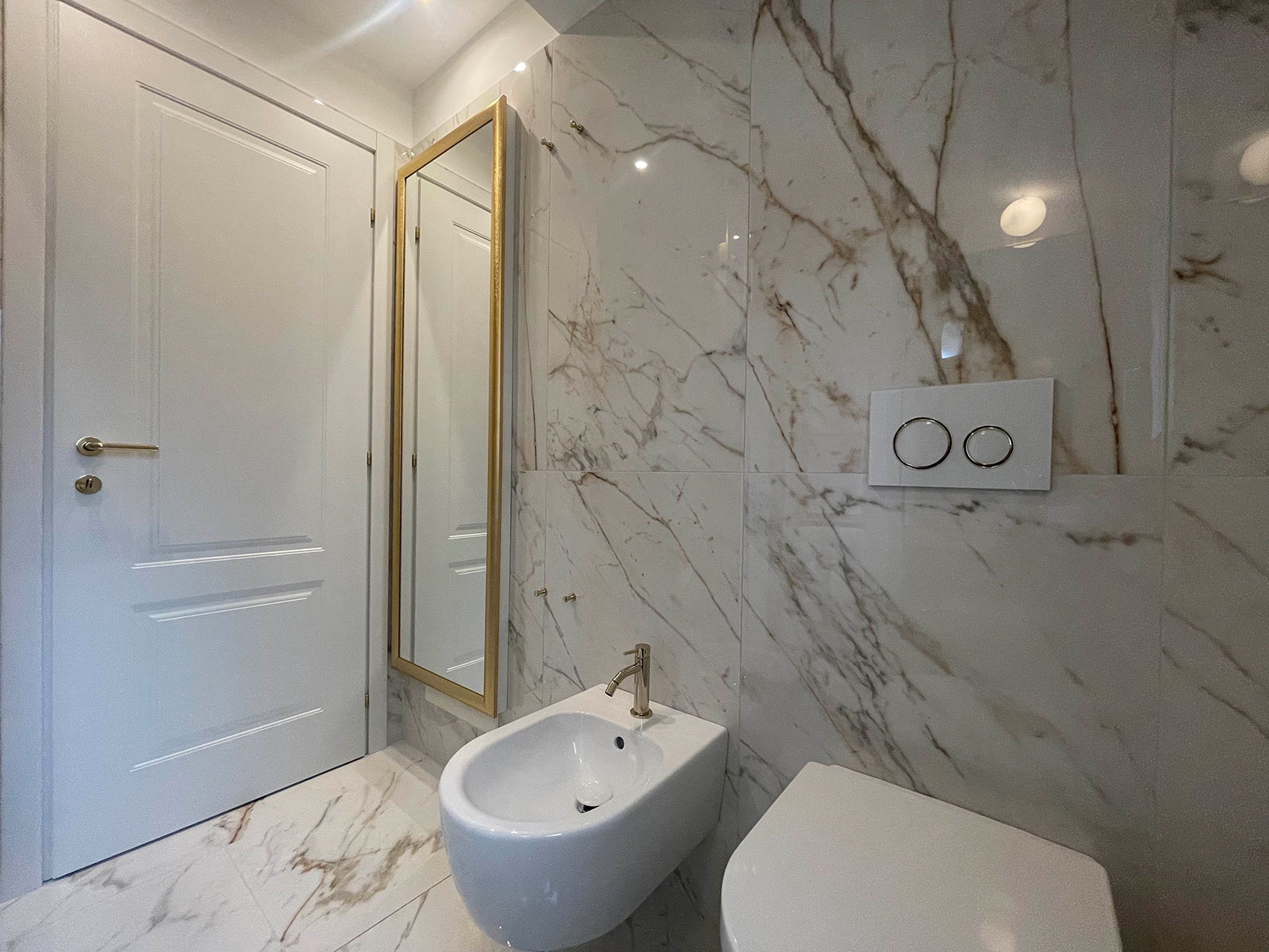 L'elegante bagno dispone di una doccia con soffione, bidet, wc, asciugacapelli e prodotti da bagno.