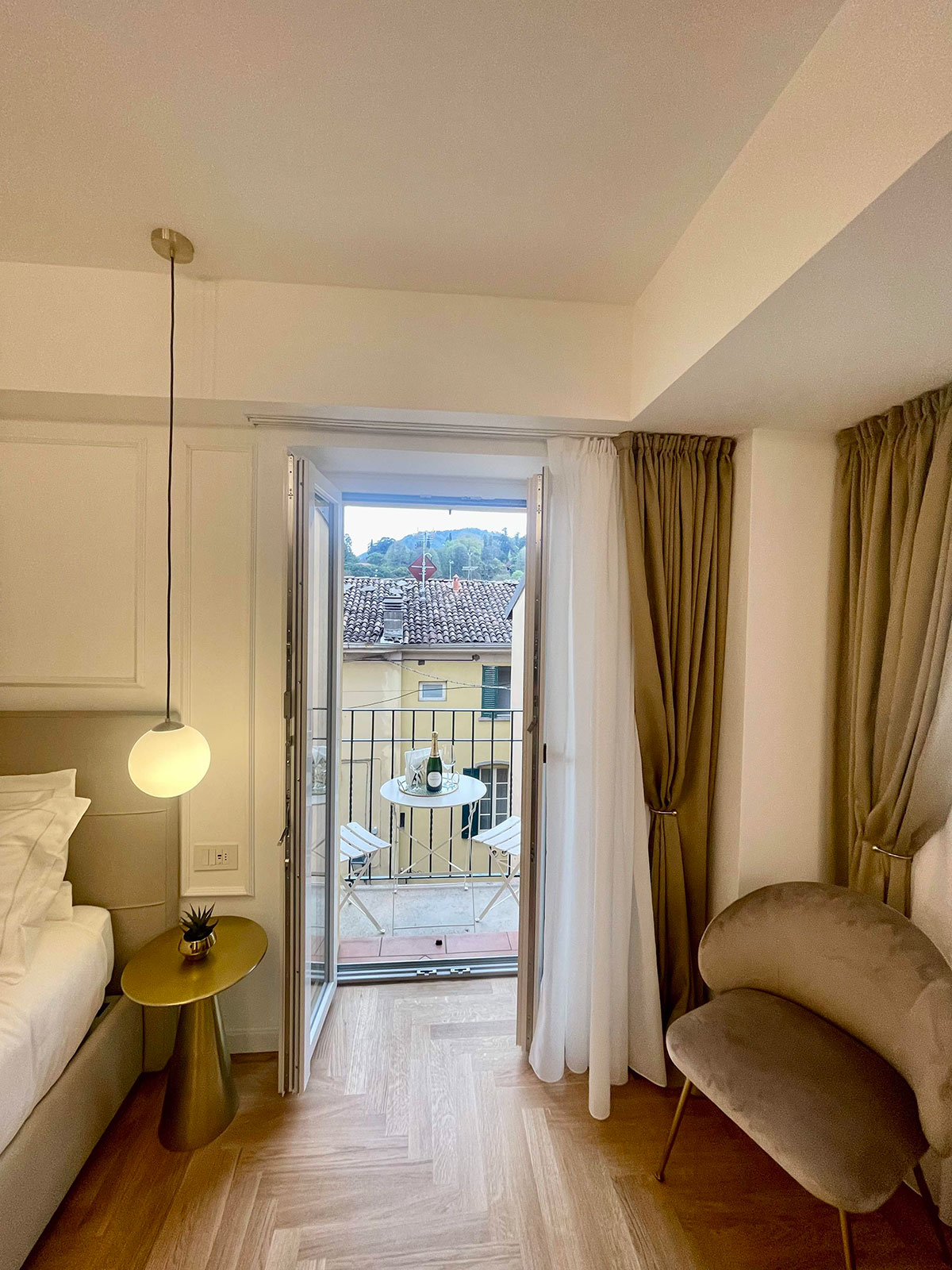 La camera da letto matrimoniale è dotata di un comodo letto king size con topper, un divano che diventa un comodo letto singolo, una pratica scrivania, una cabina armadio e una smart TV, inoltre è presente un piccolo balcone (non ha vista lago) con tavolino e due sedie, ideale per rilassarsi dopo una giornata sul lago e gustare un buon bicchiere di vino.